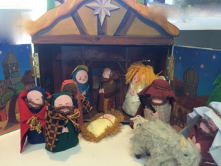 A contemporary Nativity made from small scraps of fabric, felt, and yarn from Dealer #42.