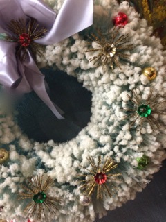 Dealer #127 hangs a fabulous flocked wreath complete with satin bow on the wall.