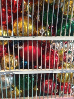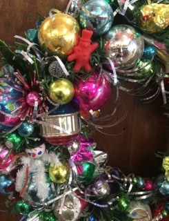 One of a kind assemblages of colorful vintage decorations form wreaths in the space of Dealer #79.