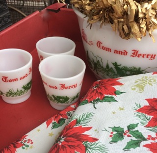 The classic Tom and Jerry bowl and mugs placed on red and green tablecloths…at Stars Too.