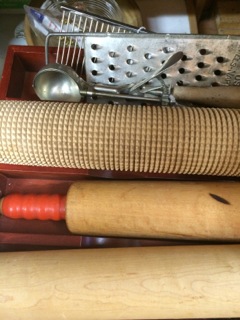 Pie tastes better when a vintage rolling pin is used. Great kitchen accessories from Dealer #44 nestle in a basket; a grand hostess gift!