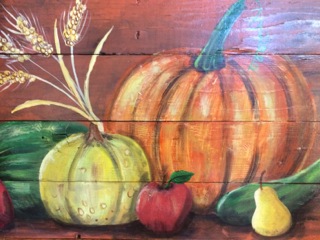 Dealer #46 has a selection of hand painted designs on wood. Here the squash that takes center stage in the form of soup or pie.