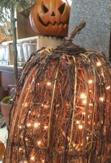 Dealer #16 has an oversized twig sculpture of a pumpkin lit with twinkle lights!