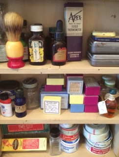 Stars Too has vintage finds for personal care in this small scale shelf. From shaving brushes to fragrance and bandages; we've got you covered.