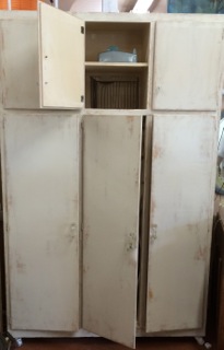 Dealer #79 has a large, lightly distressed ivory closet with storage above and swivel casters below.