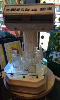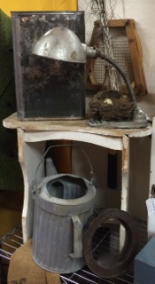 Dealer #54 has a small distressed ivory stand with bottles, feathers, nest, and all things natural. Perfect to set on top of another piece for visual interest.