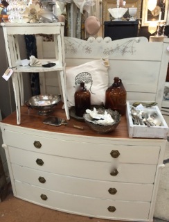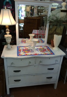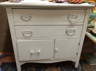 Dealer #38 has an ivory dresser with cupboard compartment ready for anywhere in the home. Check out the mixed hardware.