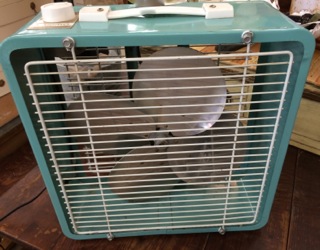 These days a fan is a necessity in most rooms; this vintage teal framed Empire circulates the air. Also from Dealer #79.