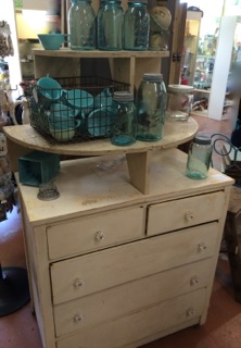 Dealer #79 stacks on the ivory and teal. Great dresser and shelving unit, Mason jars, vintage corbels and more.