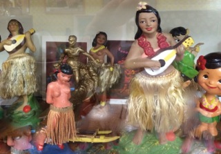 Hawaiiana rules in the space of Dealer #156; their glass case holds a strong selection of vintage hula dancer dolls.