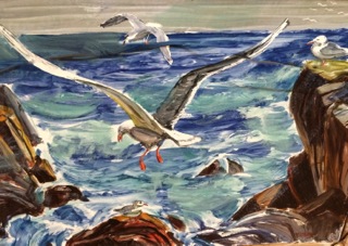 Double sided glass painting from Dealer #8 features vibrant seagulls in flight over the ocean.