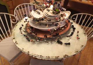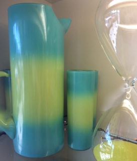 Dealer #116 has a charming beverage set in summer colors displayed with an oversized hourglass.