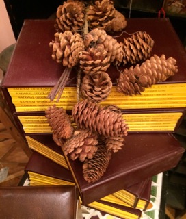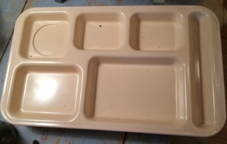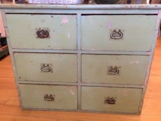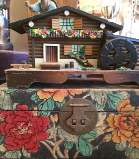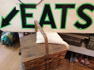 Great signage ready to hang looms precariously close to a vintage picnic basket.