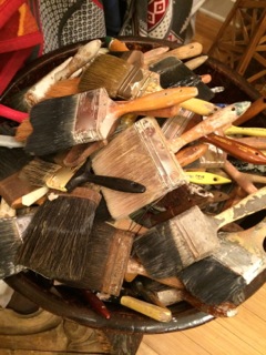 Bowls are filled with old paintbrushes in every size, width, and shape.