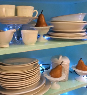 Dealer #81 has several shelves of ivory and bone restaurant dishes in all shapes and sizes.