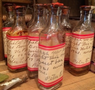 Old weathered glass jars with narrow openings are perfect for the windowsill bouquet of single stems; found at Stars Too.