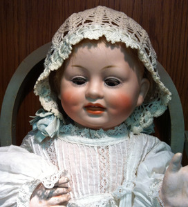 It's a baby doll! A German one at that. Dealer 48 is offering not only this cute as a button bisque doll but also the high chair for the price of $295. Two for the price of one.