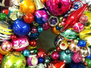 These wreaths of vintage Christmas ornaments are a blaze of color. Of course each one is an original work of art. Check out Dealer 77's space. There are several to choose from. This one is priced at $85