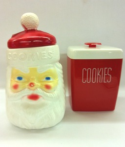 Cookies for Santa was always a tradition in our home. Only problem was the year we found Dad eating them all. That did it for us believing in Santa. Still blame Dad for bursting that illusion. Dealer 77 has the Santa cookie jar priced at $17.95 and the vintage red and white jar at $25.00.