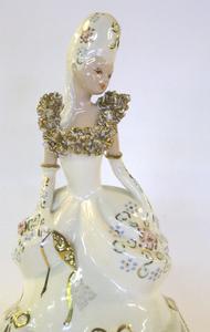 This lady looks the part of Miss Charming or so we thought while we were shopping for our cluster of ladies. She is a Muriel of California creation and offered by our pottery dealer #118 at $43.00. Be charmed by her like we were.