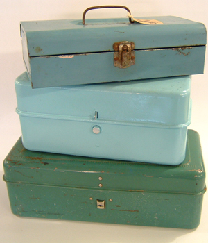 Love these vintage tool and fishing boxes, probably the color does it. You need to buy them in 3's. Priced at $16.95 to $21.00.