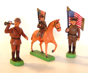 Dealer #79 has a whole troop of these celluloid soldiers. Made in Japan, these soliders are fine examples of early toy collectibles. The solider with the flag is $39.00, with the bugle is $24.00 and the solider on the horse is $45.00.