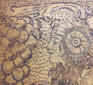 Dealer #78 has a mix of interesting canisters and boxes including this pyrography box of a female.