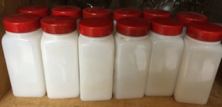 Sold individually, these twelve clean white spice jars with colorful red lids are available from Dealer #37.