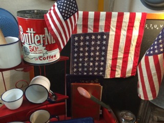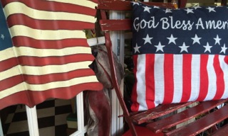 Dealer #69 has a window filled with pillows, flags, stoops and more celebrating the colors of the American flag.