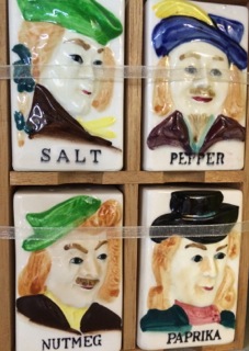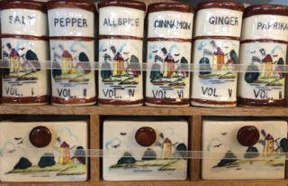 Dealer #150 always has some unique porcelain spice sets in wooden racks. Here a simple set of four.