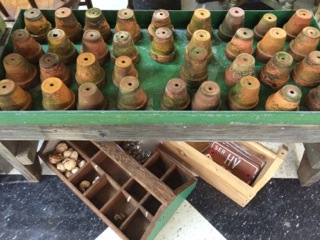A large collection of terra-cotta pots nest in a crate which rests between two stacked garden benches from Dealer #22.
