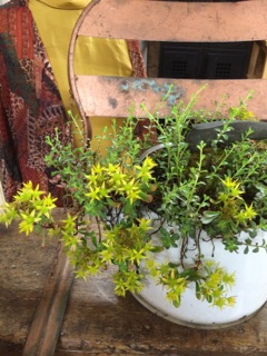 Dealer #12 has sedum spilling over the container as it rests on a great weathered chair. Perfect for the front porch!