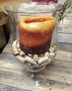 A large glass vase filled with corks and a large pillar candle will definitely be a unique centerpiece and create a lovely ambience on the patio. Available from Dealer #43.