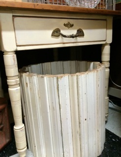 Dealer #9 has a simple ivory side table and nestled underneath is a bin made from recycled trim and moulding.