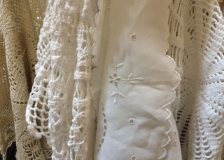 Several doilies, runners, and crocheted items hang together mixing patterns and designs; also from Dealer #4.