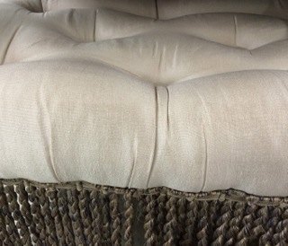 Nesting under a long table sits an elegant tufted ottoman with long fringe. Available from Dealer #80.