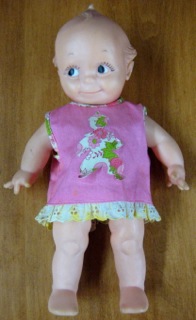 Dealer #71 has this lovable Kewpie doll in a pastel pink pinafore.