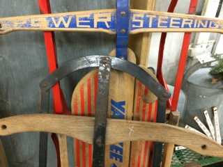 Dealer #46 leans two vintage sleds to complete a Holiday display.