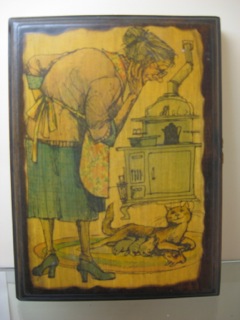 This decoupaged image of a mother cat nursing her new kittens in front of a warm stove is classic art from the 1970's. Available from Dealer #71.