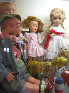 Dealer #8 has several vintage dolls with touches of white and red, but it's the two great yellow zoo animals that make it all standout.