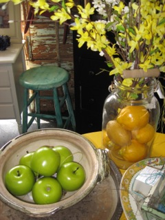 What a nice delight to turn the corner and see this lovely table setting of fruit and flowers. Perfect for a bold color spot. Great vases, mossy nests, flowers, and so much more from Dealer #17.