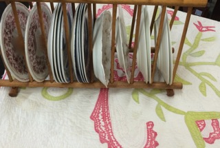 Dealer #89 shows off a two tiered antique plate rack which sits atop a vintage quilt.