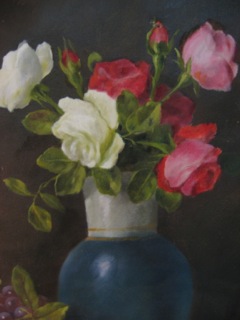This is just a corner of a floral and fruit still life from Dealer #72; but even the classic white and red roses in a blue pitcher celebrate the American spirit.
