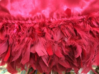 Brilliant red ostrich feathers serve as trim/fringe on this throw. Perfect for the holidays and available from Dealer #8.