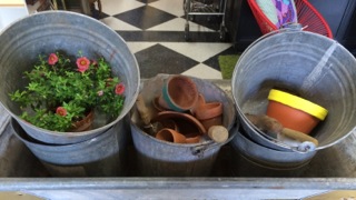 Garden season is here and the sidewalks are overflowing with outdoor items! Let's Shop joins in the craze for the gardener as well as those who just love fruit and flowers in their home! Galvanized buckets and tools fill a number of containers from the space of Dealer #99.