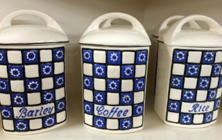 Canisters hold the basics in blue and white; get the coffee ready and don't forget the coffee ice cubes for the heat of the day! Available from Dealer #100.