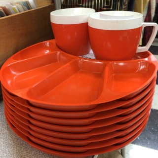 Classic compartmentalized camping plates and cups are vibrant orange and available from Dealer #84.
