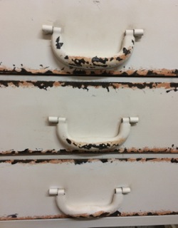 Chippy ivory iron cabinet has a display area and drawers. Available from Dealer #150.