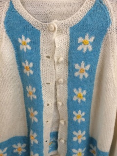 This vintage sweater with flower border in white blue and gold from Dealer #55 is perfect for our cool mornings.