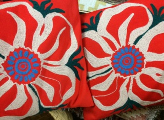 Red floral designs in crewel embroidery are eye catching and have great impact on entering a room. Available from Dealer #79.